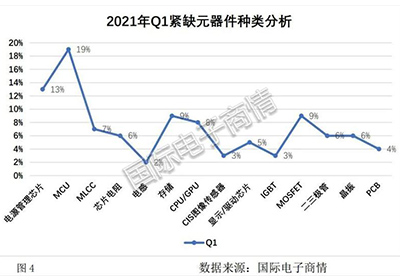 En la unua trimonato de 2021, la TOP5-kategorioj de komponantoj, kiuj mankas en Q1, estas: MCU (19%), elektromastruma blato (13%), MOSFET (9%), stokado (9%), CPU/GPU. (8%).